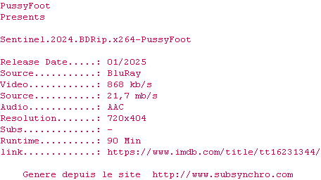 Voir le nfo de la release Sentinel.2024.BDRip.x264-PussyFoot