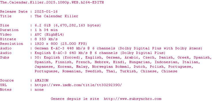 Voir le nfo de la release The.Calendar.Killer.2025.1080p.WEB.H264-EDITH
