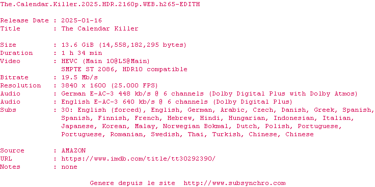 Voir le nfo de la release The.Calendar.Killer.2025.HDR.2160p.WEB.H265-EDITH