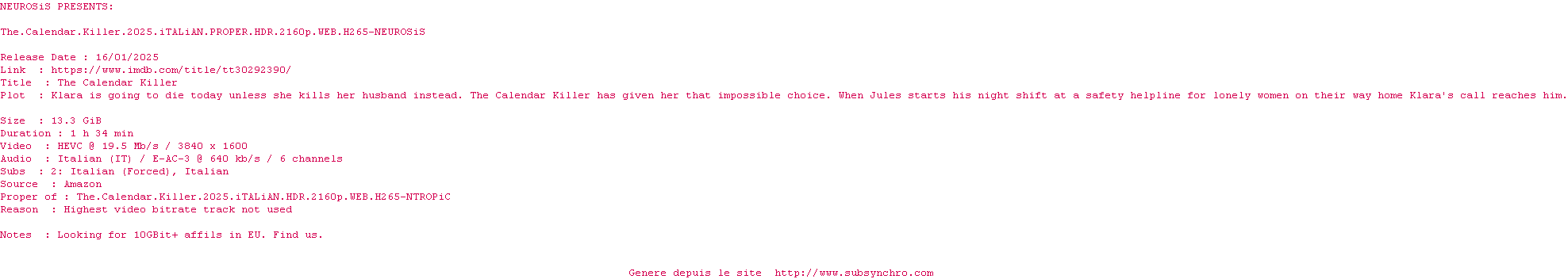 Voir le nfo de la release The.Calendar.Killer.2025.ITALiAN.PROPER.HDR.2160p.WEB.H265-NEUROSiS
