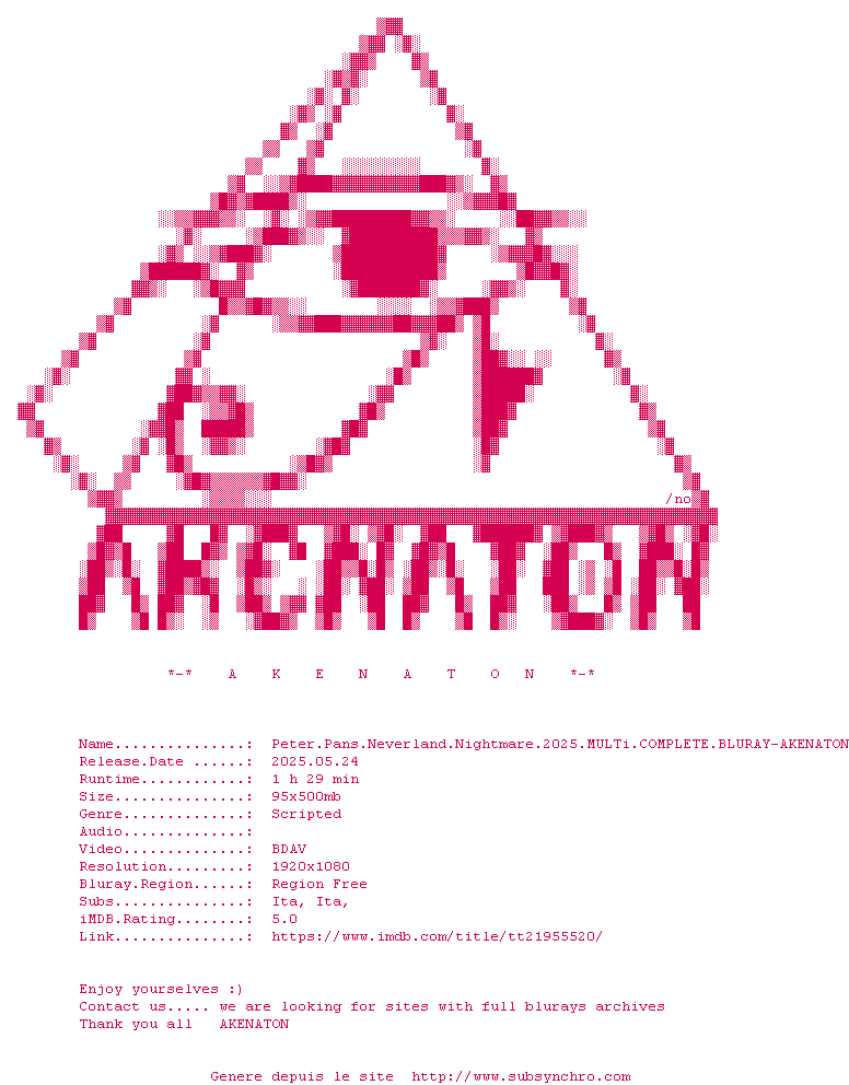 Voir le nfo de la release Peter.Pans.Neverland.Nightmare.2025.MULTi.COMPLETE.BLURAY-AKENATON