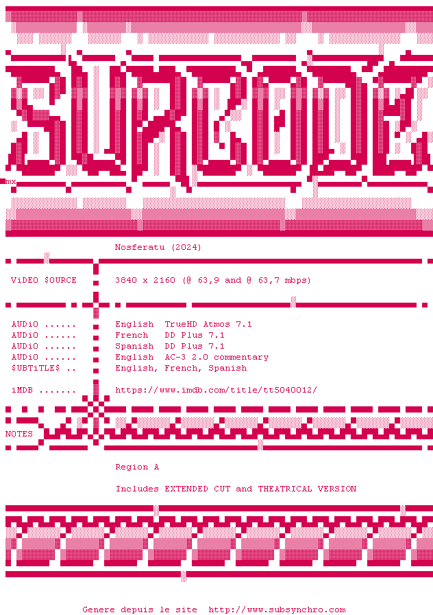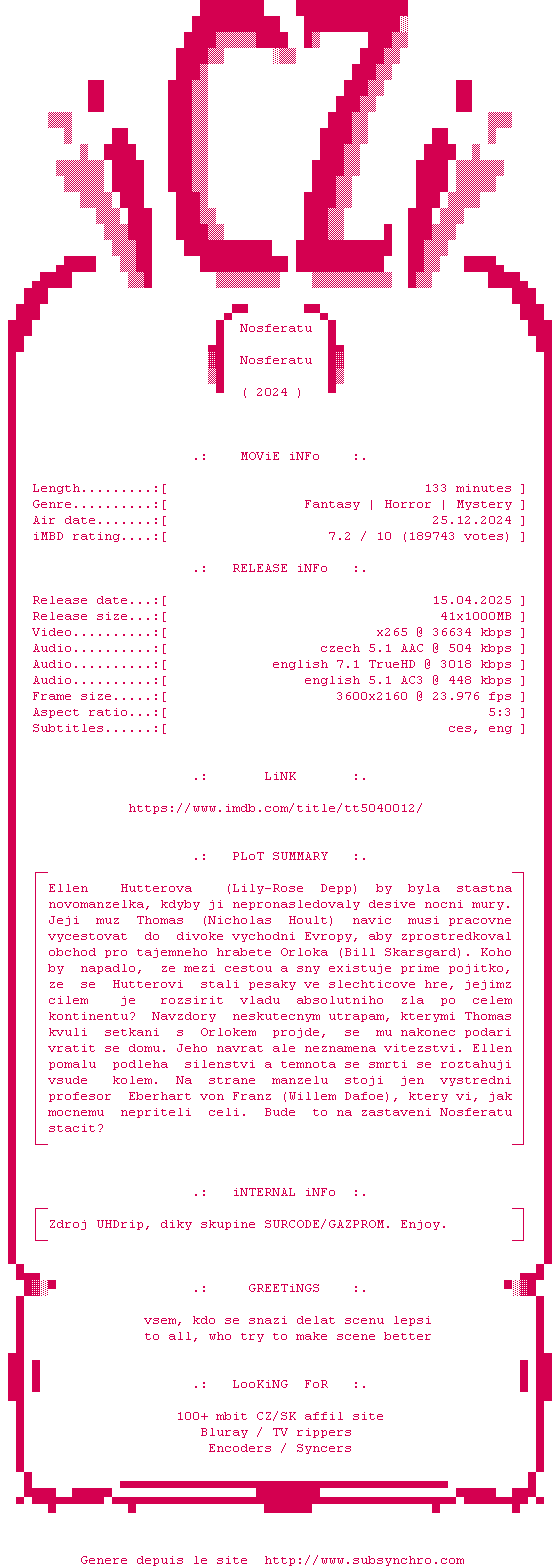 Le commentaire de acme69 Commente par acme69 (4), Le Jeudi 23 Janvier 2025 à 21h19 Superbe songe éveillé classique mais inspiré. Grande maîtrise formelle avec des moments d'extase visuelle (L'attente du fiacre dans la forêt !!...) . Des hommages à Murnau et à Herzog parfois maladroits (La main qui monte vers la chambre d'Ellen ni fait ni à faire, la peste moins impressionnante que chez Herzog...). Jeu des acteurs souvent grand-guignolesque mais qui ne me gène pas. Lily-Rose Depp porte le film avec une force et justesse tout simplement mémorables, Nicholas Hoult impeccable, Dafoe décevant car trop caricatural dans un surjeu qui reste dans les clichés du genre. Dommage qu'il y ait des problèmes de rythme et que le comte Orlok soit quasiment toujours dans l'ombre. Du cinéma magique avec quelques réserves. On est à deux doigts du chef-d'Å“uvre. Bref, un film envoûtant passionnant, à admirer et à revoir. 7 / 10 0 0
