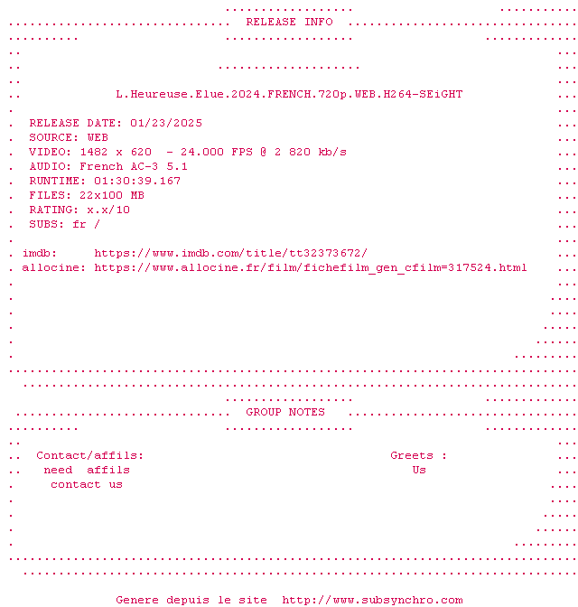 Voir le nfo de la release L.Heureuse.Elue.2024.FRENCH.720p.WEB.H264-SEiGHT