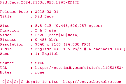 | Voir le nfo de la release Kid.Snow.2024.2160p.WEB.H265-EDITH | EDITH | Kid.Snow.2024.2160p.WEB.H265-EDITH OpenSubtitles La release Kid.Snow.2024.2160p.WEB.H265-EDITH est en 4K | 0 fichier |