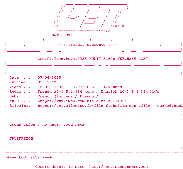 Voir le nfo de la release One.Of.Them.Days.2025.MULTI.2160p.WEB.H265-LOST