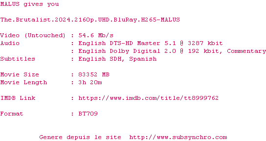 Voir le nfo de la release The.Brutalist.2024.2160p.UHD.BluRay.H265-MALUS