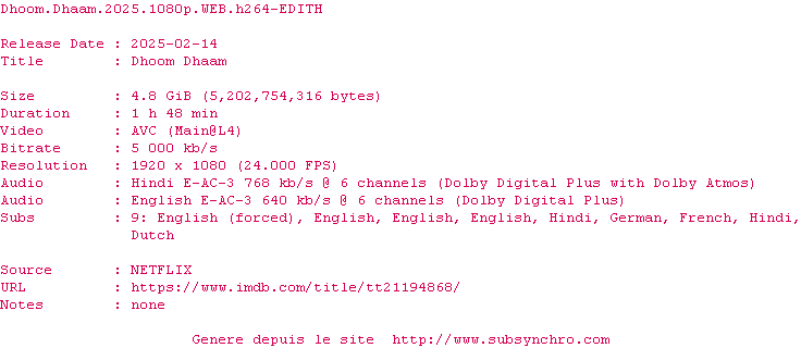 | Voir le nfo de la release Dhoom.Dhaam.2025.1080p.WEB.H264-EDITH | EDITH | Dhoom.Dhaam.2025.1080p.WEB.H264-EDITH OpenSubtitles | 0 fichier | ||