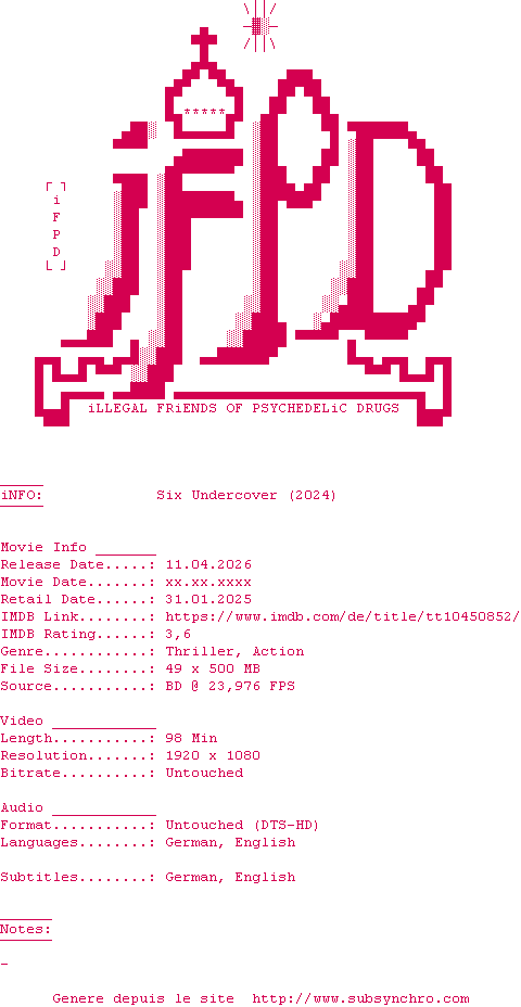 Y avez-vous pense ? Nous proposons déjà 1692 sous-titres pour le film La guerre des mafias / Six Undercover. Avez-vous essaye de voir si ces sous-titres etaient compatibles avec cette release ? On vous laisse le soin de tester cela pour nous et de contribuer au site en postant le sous-titre en cas de compatiblite constatee !