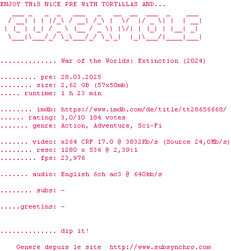 Voir le nfo de la release War.Of.The.Worlds.Extinction.2024.BDRiP.x264-GUACAMOLE