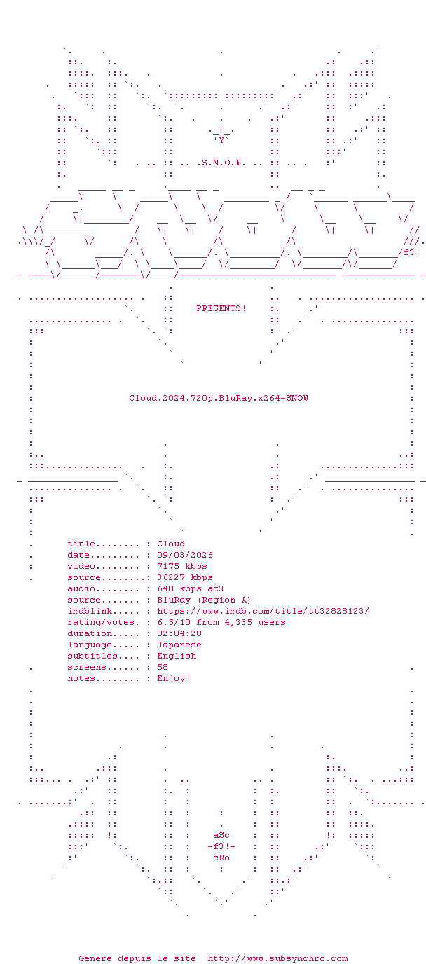 Telechargez le RSS « Fichier de la release Cloud.2024.720p.BluRay.x264-SNOW »