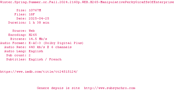 Voir le nfo de la release Winter.Spring.Summer.Or.Fall.2024.2160p.WEB.H265-ManipulativePerkyGiraffeOfEnterprise