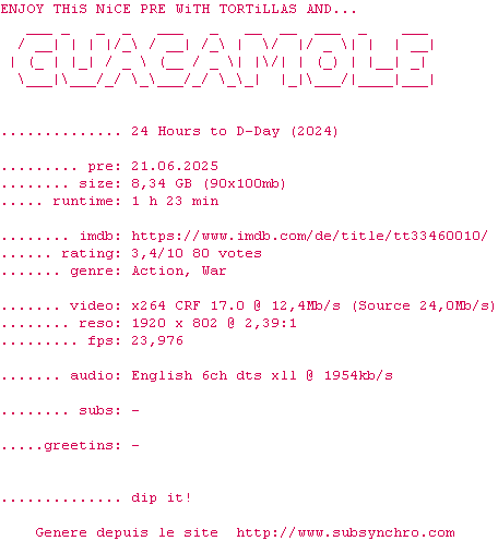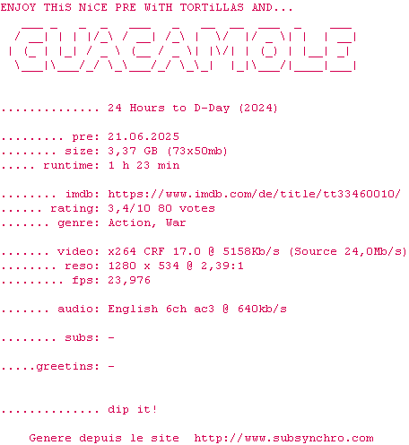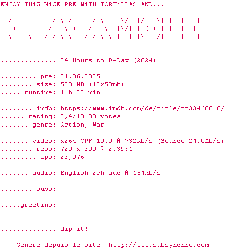 Voir le nfo de la release 24.Hours.To.D.Day.2024.BDRiP.x264-GUACAMOLE