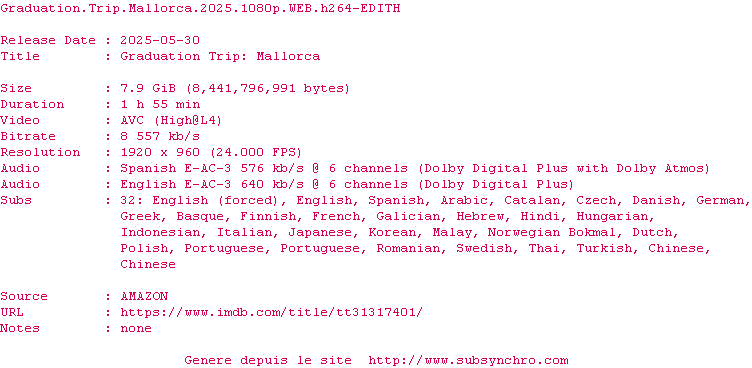 Voir le nfo de la release Graduation.Trip.Mallorca.2025.1080p.WEB.H264-EDITH