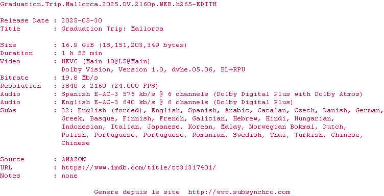 Voir le nfo de la release Graduation.Trip.Mallorca.2025.DV.2160p.WEB.H265-EDITH
