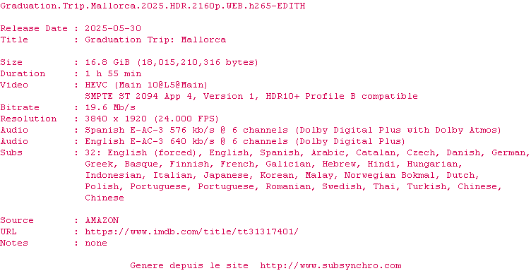 Voir le nfo de la release Graduation.Trip.Mallorca.2025.HDR.2160p.WEB.H265-EDITH