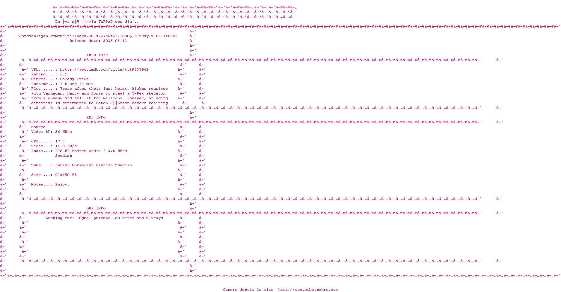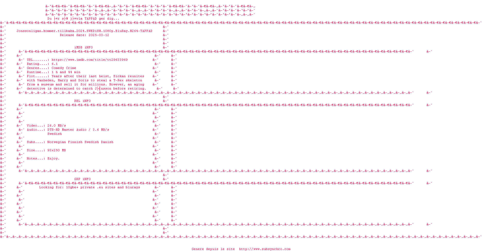 Voir le nfo de la release Jonssonligan.Kommer.Tillbaka.2024.SWEDiSH.1080p.BluRay.H264-TAPPAD