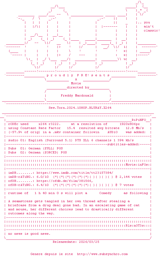 Y avez-vous pense ? Nous proposons déjà 1328 sous-titres pour le film Sew Torn. Avez-vous essaye de voir si ces sous-titres etaient compatibles avec cette release ? On vous laisse le soin de tester cela pour nous et de contribuer au site en postant le sous-titre en cas de compatiblite constatee !
