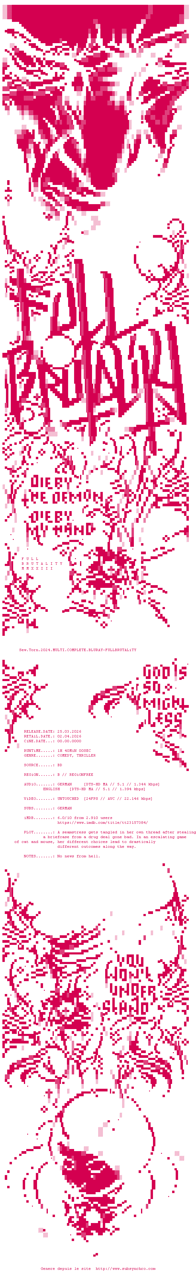 Y avez-vous pense ? Nous proposons déjà 1326 sous-titres pour le film Sew Torn. Avez-vous essaye de voir si ces sous-titres etaient compatibles avec cette release ? On vous laisse le soin de tester cela pour nous et de contribuer au site en postant le sous-titre en cas de compatiblite constatee !