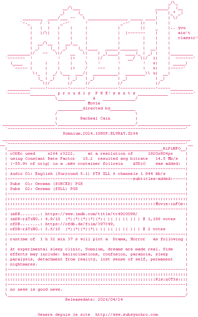 Y avez-vous pense ? Nous proposons déjà 1995 sous-titres pour le film Somnium. Avez-vous essaye de voir si ces sous-titres etaient compatibles avec cette release ? On vous laisse le soin de tester cela pour nous et de contribuer au site en postant le sous-titre en cas de compatiblite constatee !