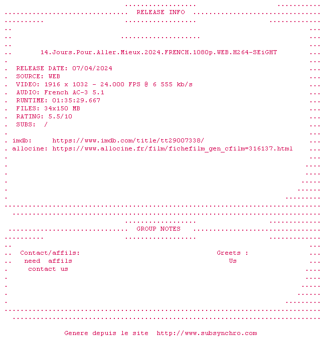 Maxime, cadre ambitieux et cartésien, ne pense qu'à sa carrière et à son futur mariage avec Nadège, la fille de son patron. Au bord du burn-out, seul à ne pas s'en rendre compte, il se retrouve embarqué par son futur beau-frère Romain au beau milieu de son pire cauchemar... Un stage de bien-être encadré par Clara et Luc, un couple de « clairvoyants », avec des stagiaires plus lunaires les uns que les autres.14 jours pour aller mieux, au cours desquels ses principes et préjugés vont être soumis au régime zénitude et bienveillance !