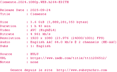 | Voir le nfo de la release Clemente.2024.1080p.WEB.H264-EDITH | EDITH | Clemente.2024.1080p.WEB.H264-EDITH OpenSubtitles | 0 fichier |