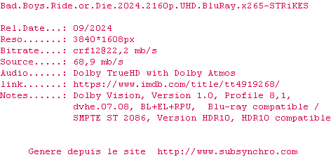 Y avez-vous pense ? Nous proposons déjà 3 sous-titres pour le film Bad Boys Ride or Die. Avez-vous essaye de voir si ces sous-titres etaient compatibles avec cette release ? On vous laisse le soin de tester cela pour nous et de contribuer au site en postant le sous-titre en cas de compatiblite constatee !