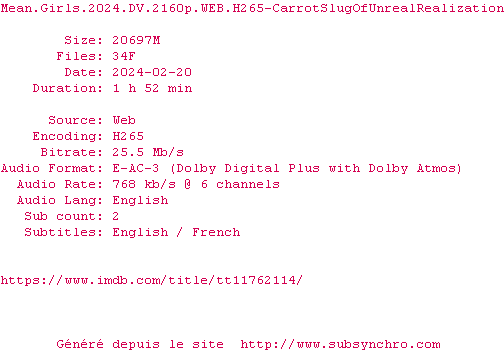 Telechargez le RSS « Fichier de la release Mean.Girls.2024.DV.2160p.WEB.H265-CarrotSlugOfUnrealRealization »
