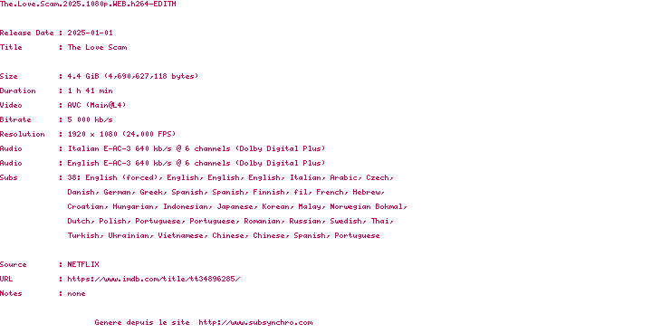 Voir le nfo de la release The.Love.Scam.2025.2160p.WEB.H265-EDITH