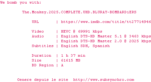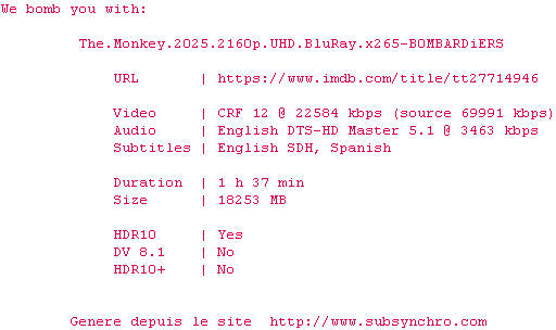 Voir le nfo de la release The.Monkey.2025.2160p.UHD.BluRay.x265-B0MBARDiERS