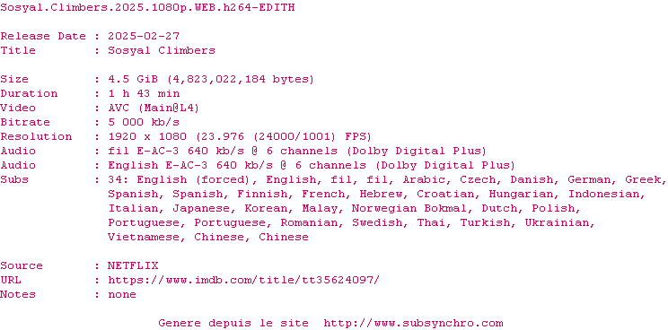 Voir le nfo de la release Sosyal.Climbers.2025.1080p.WEB.H264-EDITH