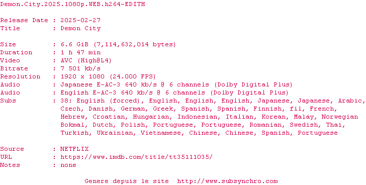| Voir le nfo de la release Demon.City.2025.1080p.WEB.H264-EDITH | EDITH | Demon.City.2025.1080p.WEB.H264-EDITH OpenSubtitles | 0 fichier | ||