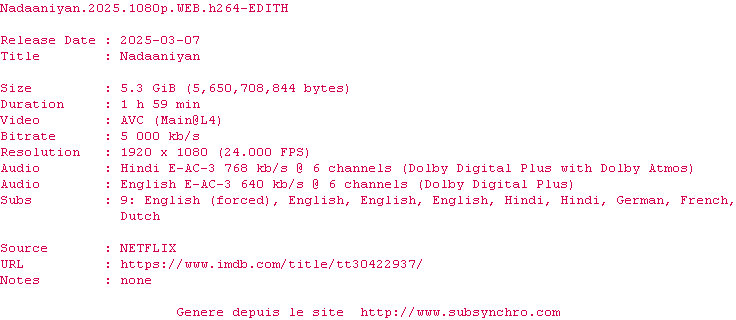 | YTS | Nadaaniyan.2025.1080p.WEBRip.x264.AAC5.1-YTS OpenSubtitles | 0 fichier |