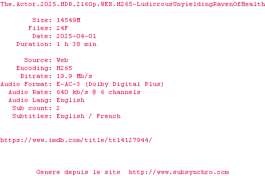 Voir le nfo de la release The.Actor.2025.HDR.2160p.WEB.H265-LudicrousUnyieldingRavenOfHealth