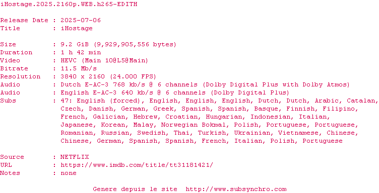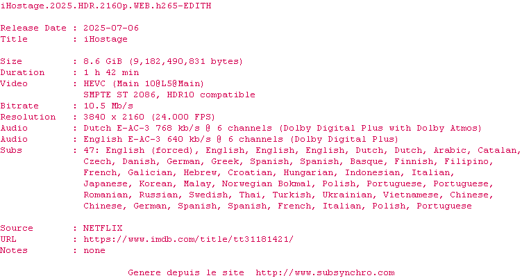 Voir le nfo de la release IHostage.2025.HDR.2160p.WEB.H265-EDITH