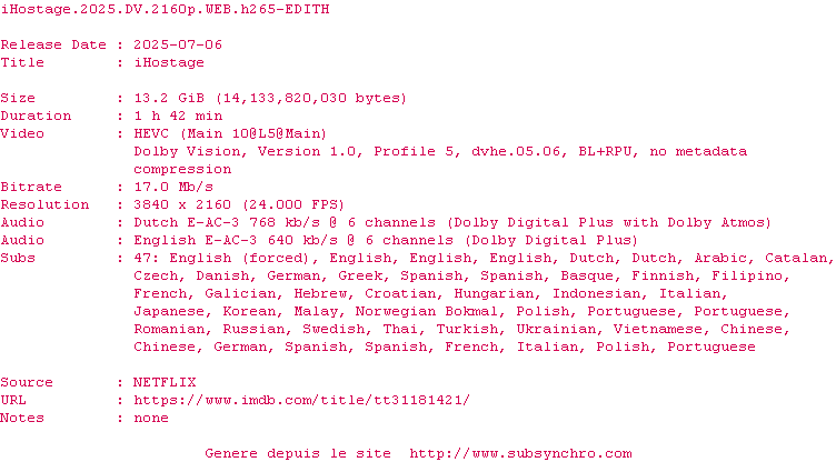 Voir le nfo de la release IHostage.2025.DV.2160p.WEB.H265-EDITH