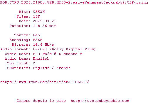 Voir le nfo de la release MOB.COPS.2025.2160p.WEB.H265-EvasiveVehementJackrabbitOfPurring