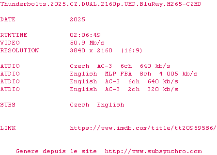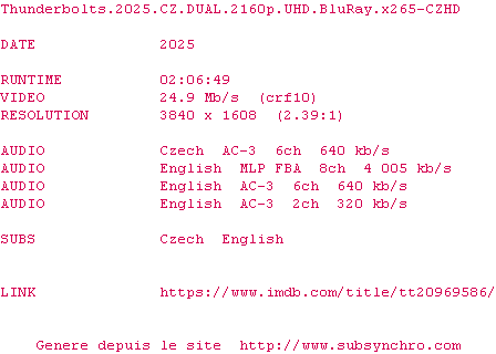 Voir le nfo de la release Thunderbolts.2025.CZ.DUAL.2160p.UHD.BluRay.H265-CZHD