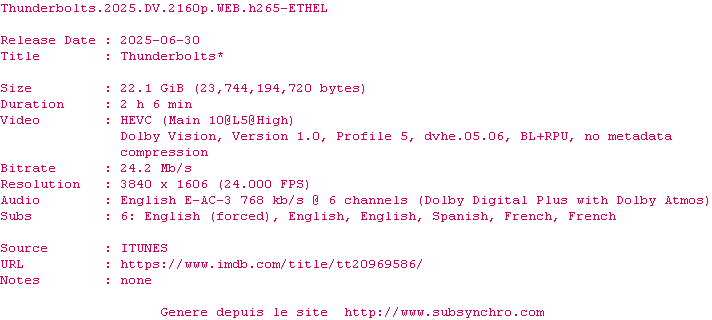 Voir le nfo de la release Thunderbolts.2025.DV.2160p.WEB.H265-ETHEL