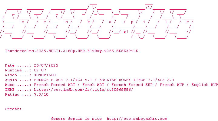 Voir le nfo de la release Thunderbolts.2025.MULTi.2160p.UHD.BluRay.x265-SESKAPiLE