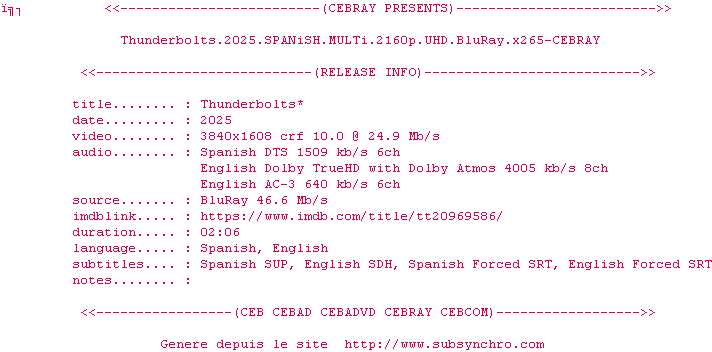 Voir le nfo de la release Thunderbolts.2025.SPANiSH.MULTi.2160p.UHD.BluRay.x265-CEBRAY