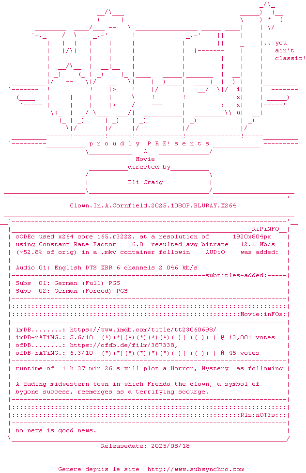 Voir le nfo de la release Clown.In.A.Cornfield.2025.MULTI.COMPLETE.BLURAY-FULLBRUTALiTY