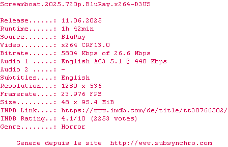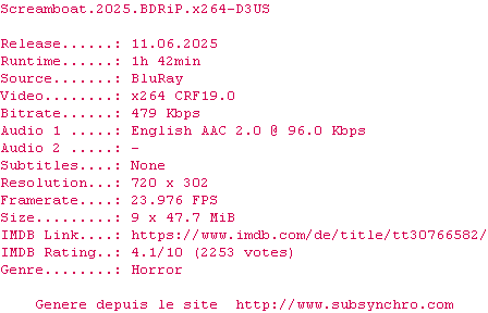Voir le nfo de la release Screamboat.2025.BDRiP.x264-D3US