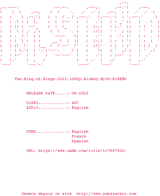 Voir le nfo de la release The.King.Of.Kings.2025.1080p.BluRay.H264-RiSEHD