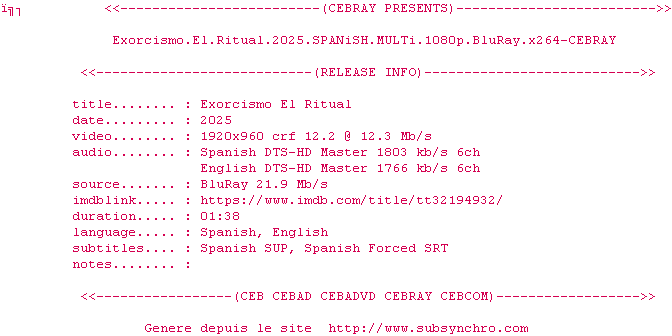 Telechargez le RSS « Fichier de la release Exorcismo.El.Ritual.2025.SPANiSH.MULTi.1080p.BluRay.x264-CEBRAY »
