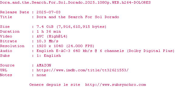 | Voir le nfo de la release Dora.And.The.Search.For.Sol.Dorado.2025.1080p.WEB.H264-DOLORES | DOLORES | Dora.And.The.Search.For.Sol.Dorado.2025.1080p.WEB.H264-DOLORES OpenSubtitles | 0 fichier |