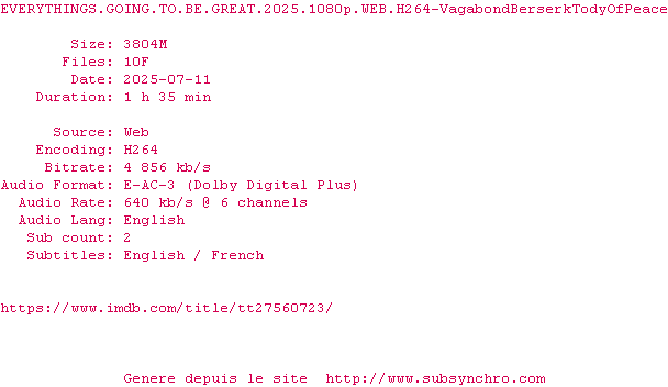 Voir le nfo de la release EVERYTHINGS.GOING.TO.BE.GREAT.2025.2160p.WEB.H265-VagabondBerserkTodyOfPeace