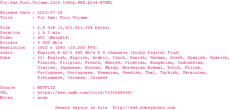 | YTS | Vir.Das.Fool.Volume.2025.1080p.WEBRip.x264.AAC5.1-YTS OpenSubtitles | 0 fichier |