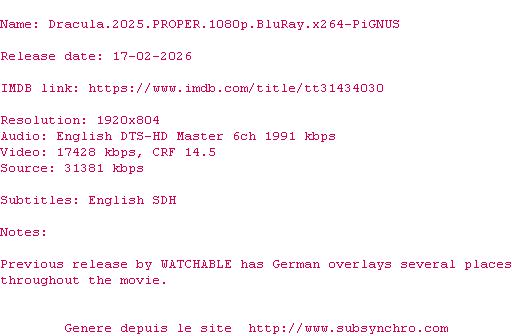 Y avez-vous pense ? Nous proposons déjà 4 sous-titres pour le film Dracula: A Love Tale. Avez-vous essaye de voir si ces sous-titres etaient compatibles avec cette release ? On vous laisse le soin de tester cela pour nous et de contribuer au site en postant le sous-titre en cas de compatiblite constatee !