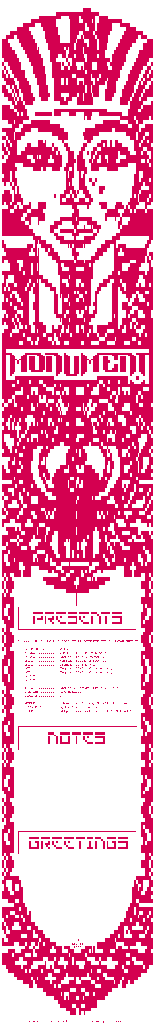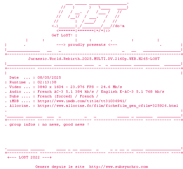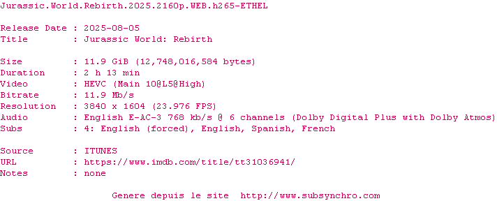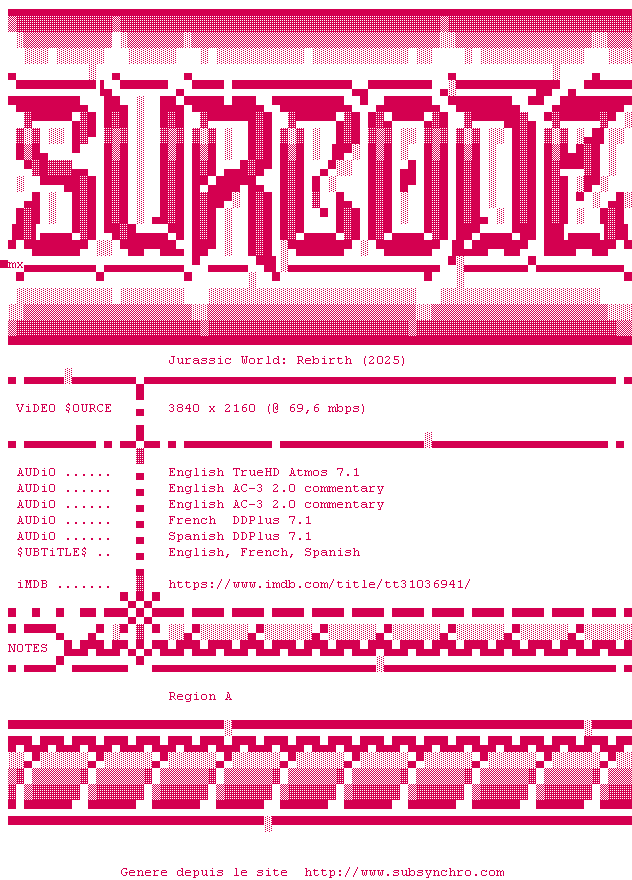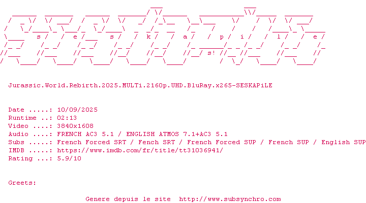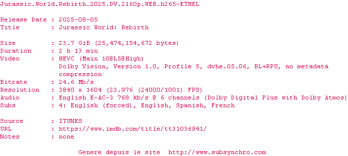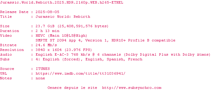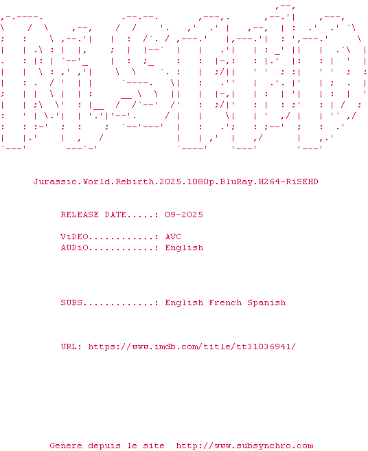 Cinq ans après JURASSIC WORLD : LE MONDE D’APRÈS, l’environnement de la planète s’est révélé hostile pour la plupart des dinosaures. Ceux qui subsistent vivent dans des zones équatoriales isolées, aux conditions proches de celles de leur ère d’origine. Parmi ces créatures terrifiantes, trois spécimens renferment peut-être la clé d’un remède capable de changer le destin de l’humanité.