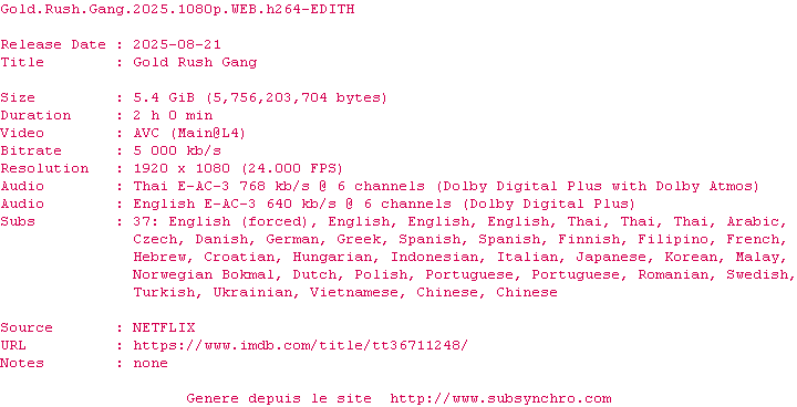 | YTS | Gold.Rush.Gang.2025.1080p.WEBRip.x264.AAC5.1-YTS OpenSubtitles | 0 fichier |